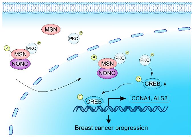 近日,一项发表在《Science Advances》(IF=12.804)上的来自复旦大学生物医学研究院/附属肿瘤医院柳素玲团队的研究揭示了三阴性乳腺癌特异性高表达的MSN(moesin蛋白)可以通过与核蛋白NONO相互作用促进激酶PKCζ的核定位,从而磷酸化CREB并激活了其下游信号通路,为基于MSN和下游信号通路开发新的针对三阴性乳腺癌的治疗方法提供了有力的证据。
