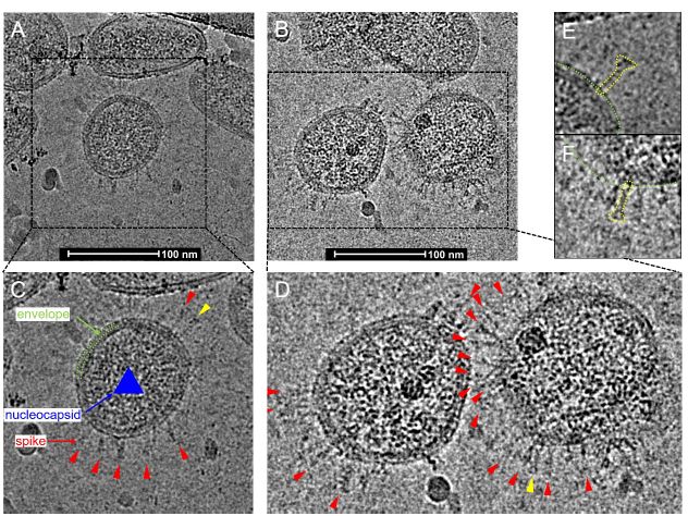 病毒体颗粒为大致球形或中等多边形,直径范围为80nm-160nm。 对于大多数病毒体,其外围是清晰界定的,并被脂质双层包裹,这在冷冻EM图像中可以清楚地看到。 在脂质双层的紧下方是SARS-CoV-2的核酸和核衣壳蛋白形成的浓缩物质。 尽管许多颗粒在纯化或失活过程中失去了Spikes,但20%-30%的病毒体在包膜周围仍然有Spikes。