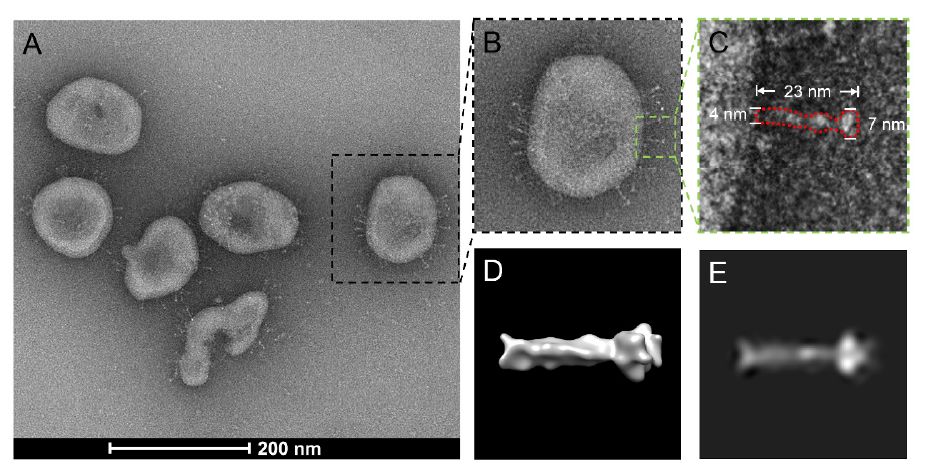 病毒粒子的表面是从宿主细胞获得的脂质双层,其上有几个重要的结构蛋白,包括刺突(S)蛋白,包膜(E)蛋白和膜(M)蛋白。 S蛋白,包括S1亚基和S2亚基,被认为是冠状病毒中最重要的蛋白质。 S1亚基促进与宿主细胞的附着,而S2亚基则参与病毒与宿主膜的后续融合。最近考虑到SARS-CoV-2结构的一些研究都集中在S蛋白上。然而,上述所有蛋白质都是在实验室中通过重组表达系统工程化的,而不是从真实病毒中工程化的,因此仍然缺乏整个病毒体的结构。此外,由于可能传播的高风险,安全性是限制SARS-CoV-2病毒研究的主要因素之一,必须在3级(BSL-3)生物安全实验室中操作活病毒。