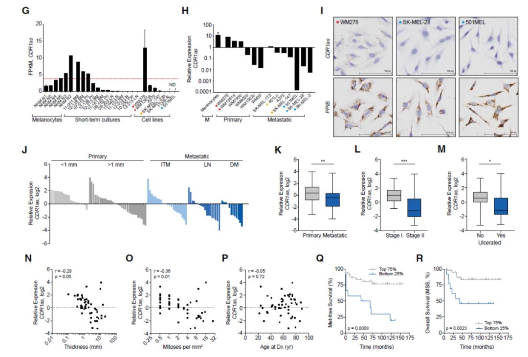 研究者首先分析了4例黑色素细胞和10例短培养黑色素瘤细胞(melanoma short-term cultures,STCs)的RNA-seq数据,分析了其中的circRNA表达情况。分析表明,CDR1as表达下调与肿瘤侵袭有关。