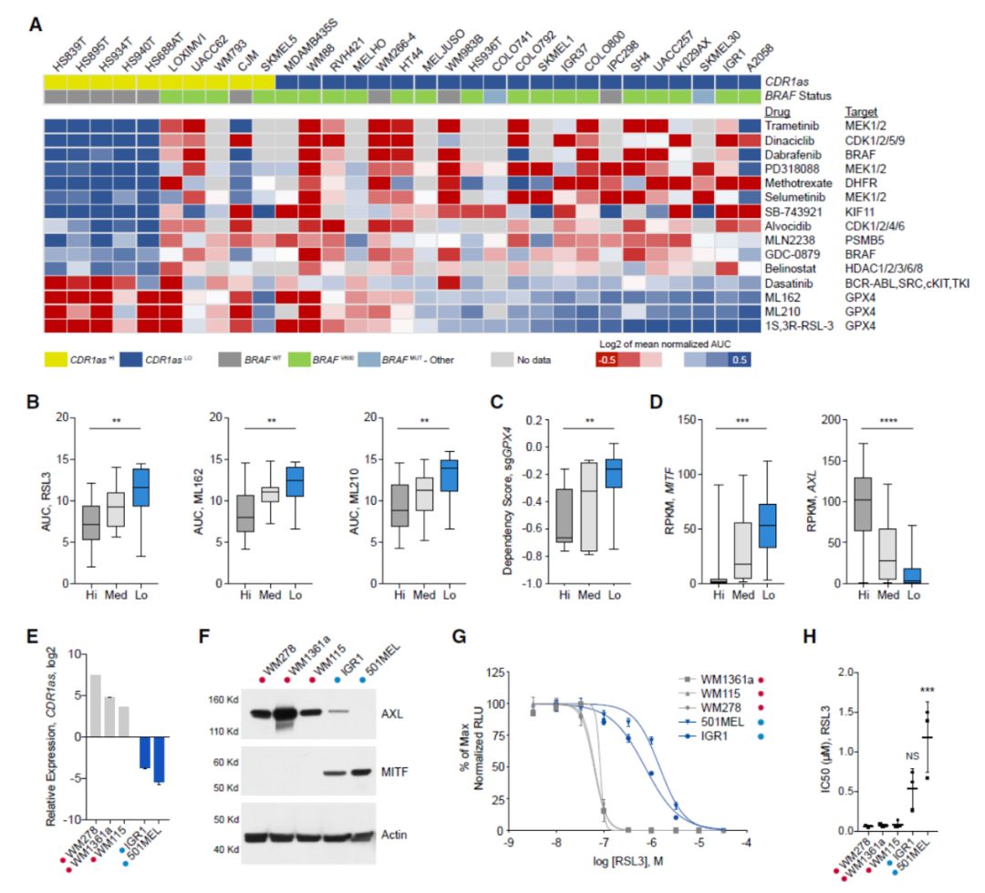 最后,为分析CDR1as表达状态与黑色素瘤中药物敏感性和基因型的相关性,作者在Depmap和CTRP的数据中进行了挖掘,并结合CCLE的数据对所有相关细胞中CDR1as表达状态进行了分组,分为高表达,中表达和低表达三组。CDR1as表达值与BRAF突变的关系分析表明CDR1as低表达的细胞更高比例携带了BRAF突变,高表达CDR1as的细胞对GPX4抑制剂更敏感,而黑色素瘤中GPX4抑制剂的敏感性与MITF / AXL基因的表达有关,MITF低表达且AXL高表达的细胞对GPX4抑制剂更敏感,但对MAPK抑制剂等药物不敏感。作者分析发现CDR1as高表达的细胞倾向于表现出MITF低表达和AXL高表达,而CDR1as低表达的细胞倾向于表现出MITF高表达和AXL低表达。实验结果也表明CDR1as表达状态与GPX4抑制剂敏感性有相关性,低表达CDR1as组的细胞对GPX4抑制剂更敏感。然而在高表达CDR1as的细胞中干扰CDR1as后并不能提高对GPX4的敏感性,说明CDR1as可作为黑色素瘤对GPX4抑制剂敏感性的指标,但并非该药物发挥功能的关键因素。