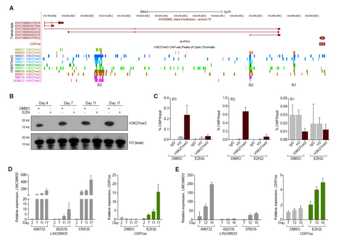 研究者进一步探索了黑色素瘤中CDR1as的生成调控方式。结果显示CDR1as来源于非编码RNA基因LINC00632,其表达与LINC00632高度相关,更一步研究显示黑色素瘤中LINC00632/CDR1as的表达是受到EZH2/PRC2的调控。