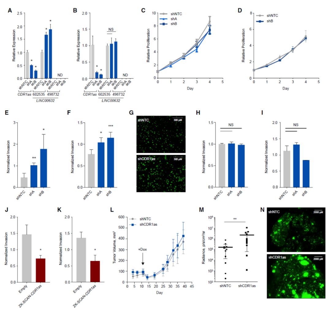 为进一步证明CDR1as在黑色素瘤迁移侵袭中的作用,研究者构建了Dox诱导表达靶向CDR1as的shRNA分子的模型,结果显示在低侵袭性高表达CDR1as的黑色素瘤细胞系(WM278和WM115)中干扰CDR1as并不能显著影响细胞增殖,但可以显著提高细胞侵袭能力。在低表达LINC00632/CDR1as的细胞(SK-MEL-28 和 501MEL)中,干扰CDR1as对侵袭表型没有影响。SK-MEL-28 和 501MEL细胞中过表达CDR1as能降低侵袭性,体内成瘤实验表明,干扰CDR1as并不显著改变肿瘤大小和生长速度,但可以显著体提高肺转移比例。