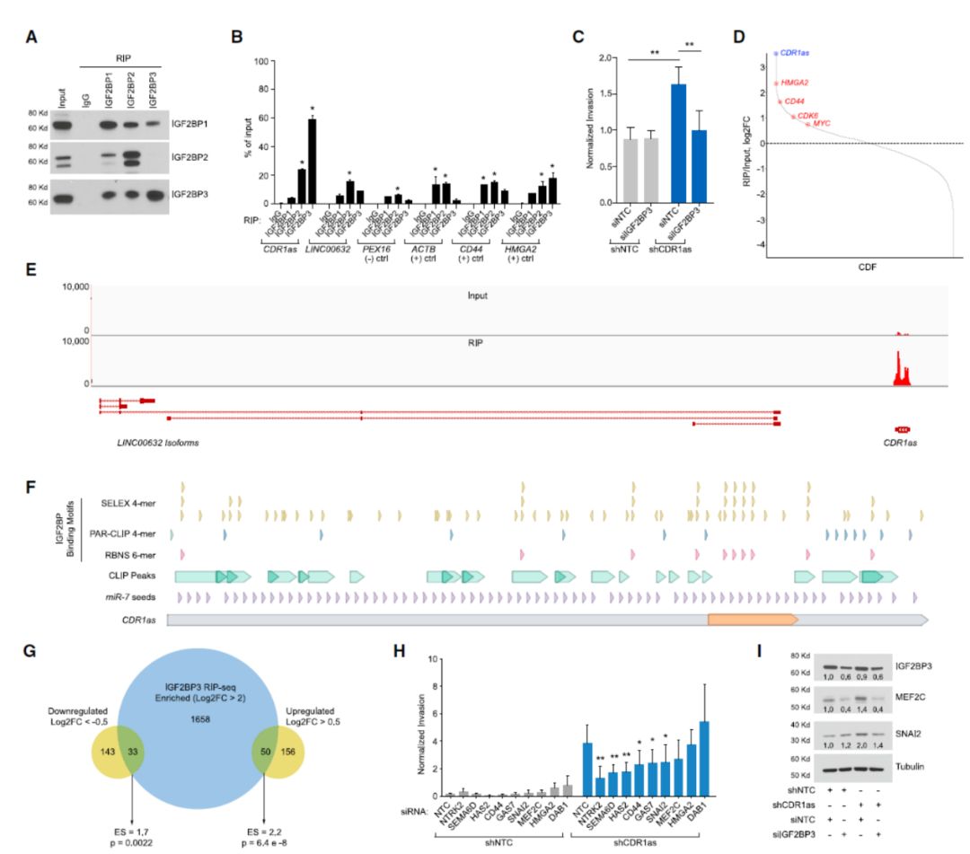 为揭示CDR1as在黑色素瘤中的作用机制,研究者首先思考了CDR1as可能的相互作用蛋白。与传统思路不同,研究者首先从CLIP-seq的在线数据中分析了可能的结合蛋白,并从中发现了IGF2BP家族蛋白存在与CDR1as相互作用的证据。为进一步验证,研究者进行了RIP分析,发现IGF2BP3对CDR1as的富集作用最强,并且对LINC00632的结合不高,说明IGF2BP3具有特异性结合CDR1as的作用。