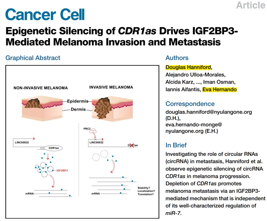[1] Douglas H., et al., Epigenetic Silencing of CDR1as Drives IGF2BP3-Mediated Melanoma Invasion and Metastasis. Cancer Cell, 2020.