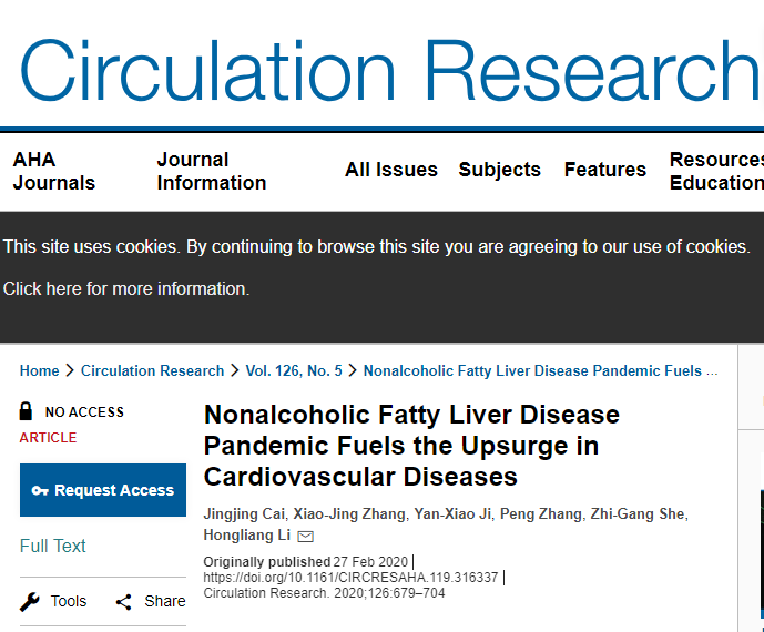 [1] Jingjing Cai, et al., Nonalcoholic Fatty Liver Disease Pandemic Fuels the Upsurge in Cardiovascular Diseases. Circulation Research.2020
