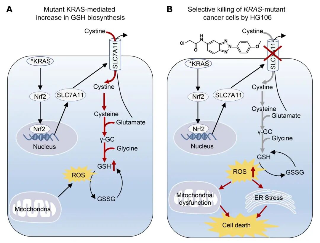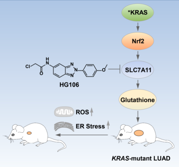 通过建立靶向SCL7A11/xCT的细胞功能实验体系,研究人员开展小分子药物筛选,鉴定并优化出能有效抑制SCL7A11/xCT活性的新一代小分子抑制剂HG106。HG106能浓度和时间依赖性地降低细胞内胱氨酸和谷胱甘肽水平,升高胞内氧化压力,降低线粒体膜电势,诱发KRAS突变细胞特异性死亡。研究人员最后利用KRAS突变肿瘤细胞异种移植模型、人源肺腺癌组织异种移植瘤模型以及LSL-KrasG12D/+;Trp53flox/flox小鼠肺癌模型检验HG106的体内抗肿瘤活性。研究发现,HG106能有效抑制KRAS肺腺癌的生长,延长了荷瘤鼠生存期。本研究成果为KRAS突变肺腺癌的治疗提供新思路和新手段。