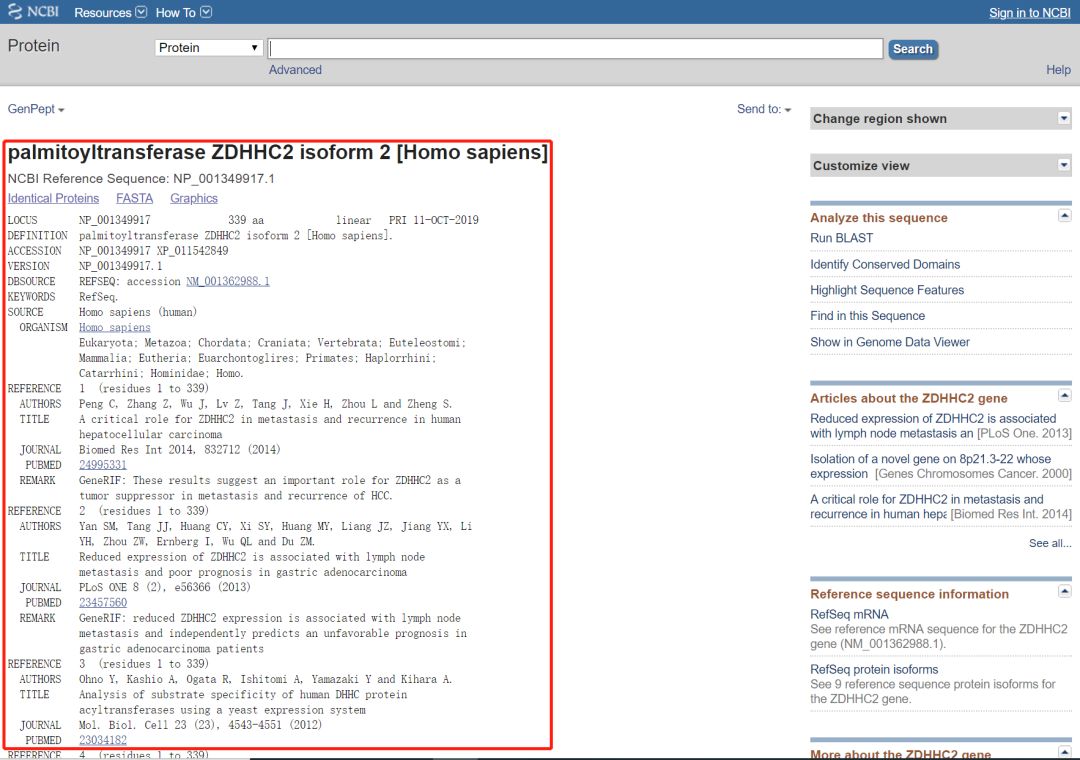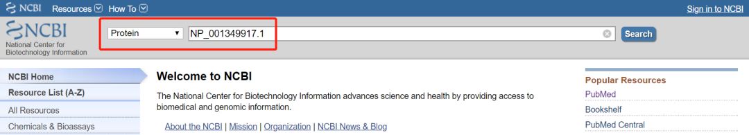 5、将该文件导入搜库软件,可对蛋白进行定性分析,继而得到差异蛋白。在NCBI首页选择“Protein”,并输入差异蛋白的Accession Number,点击“Search”: