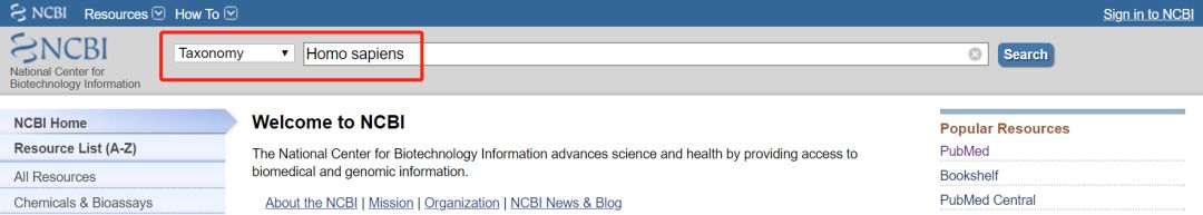 1、在首页选择“Taxonomy数据库”(共收录有将近300,000种物种信息,分类数据库以每月增加2200个新分类单位的速度在增长),输入物种的拉丁文名称,点击“Search”:
