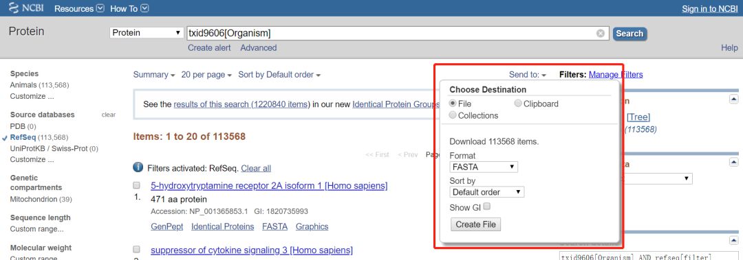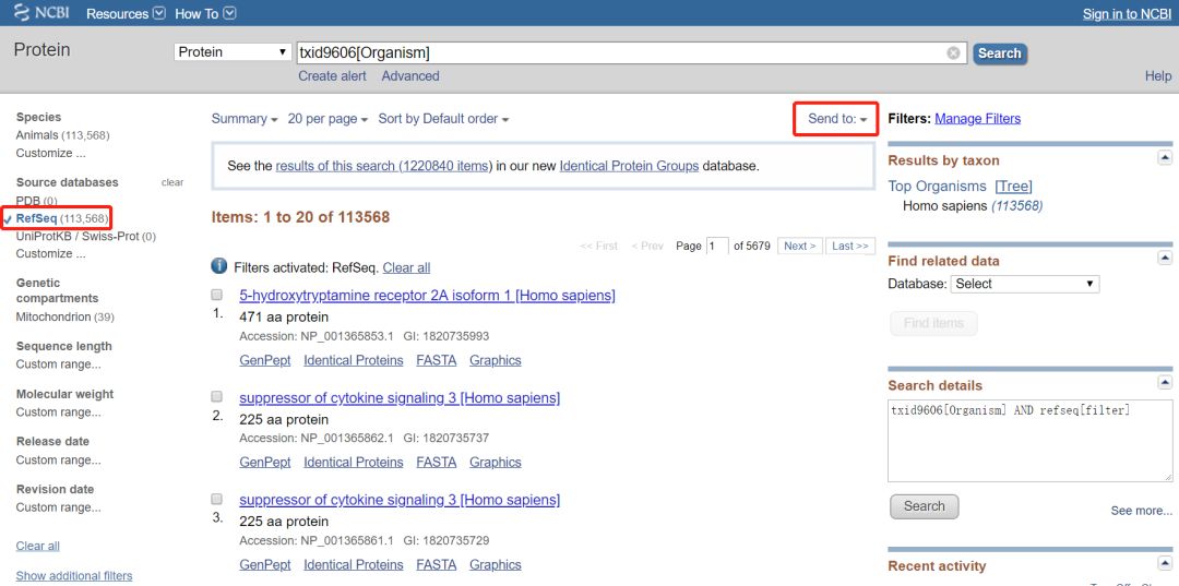 4、然后点击“Send to”,下载该物种的蛋白序列数据库,文件格式通常是FASTA格式,得到的“sequence.fasta”文件,可以通过记事本或Excel打开: