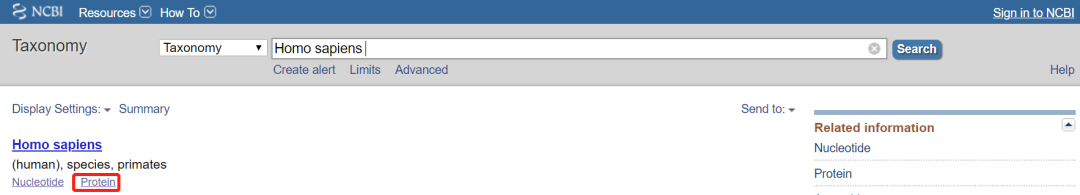 2、在Taxonomy界面,会显示该物种的Nucleotide和Protein,选择“Protein”: