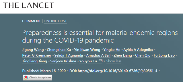 2020年3月16日,屠呦呦团队在国际顶级医学期刊Lancet 在线发表题为“Preparedness is essential for malaria-endemic regions during the COVID-19 pandemic”的通讯文章,该文章指出防范是应对任何公共卫生危机的关键,疟疾流行国家必须做好准备应对COVID-19可能带来的挑战,同时最大程度地减少对疟疾控制的破坏。