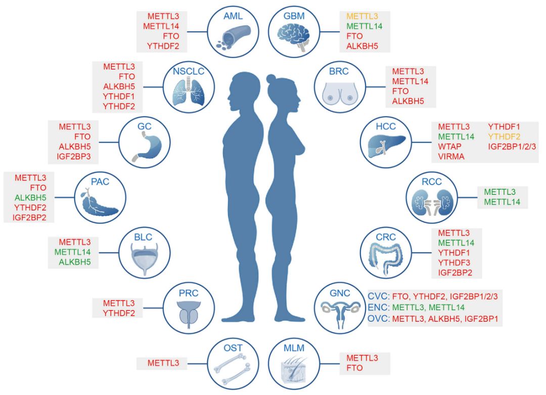 肿瘤中常见m6A修饰相关酶的变化