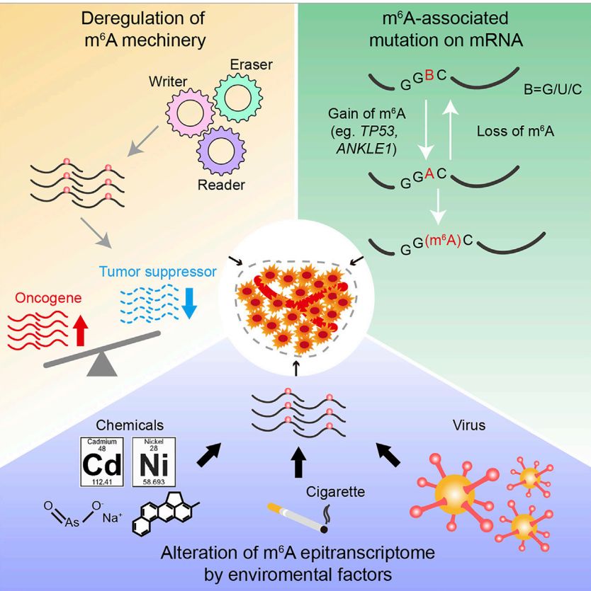 环境因素也可以通过改变m6A修饰状态对肿瘤的发生发展产生影响,包括吸烟,病毒感染等致癌因素与RNA m6A修饰状态有关。