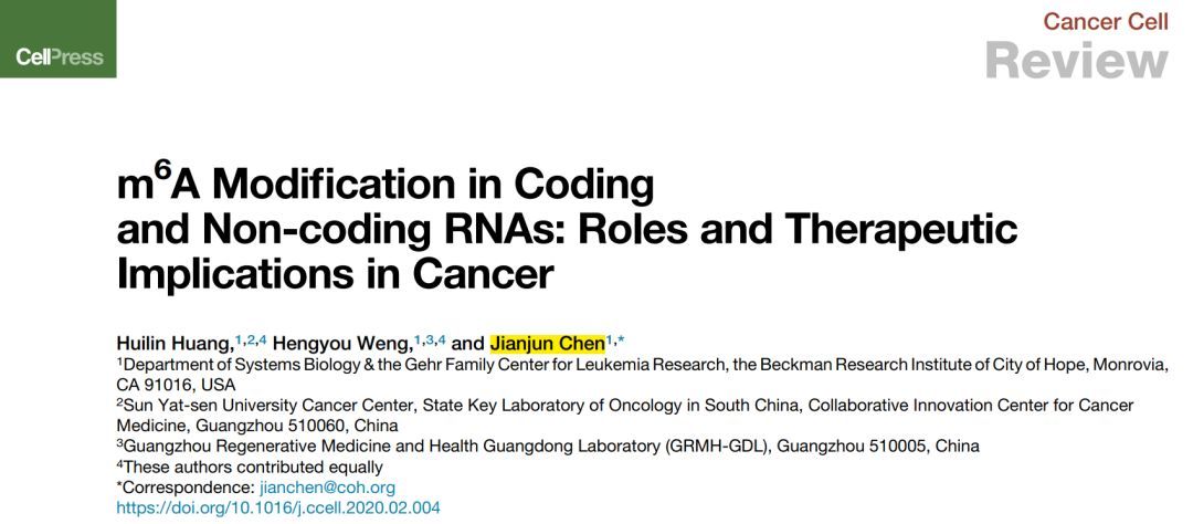 RNA m6A修饰是近期炙手可热的热点研究方向之一。近日,一篇在线发表在《Cancer Cell》杂志上的来自美国希望之城Beckman研究所陈建军教授的综述文章,系统回顾了目前编码与非编码RNA的m6A修饰研究进展,以及在肿瘤中的作用。