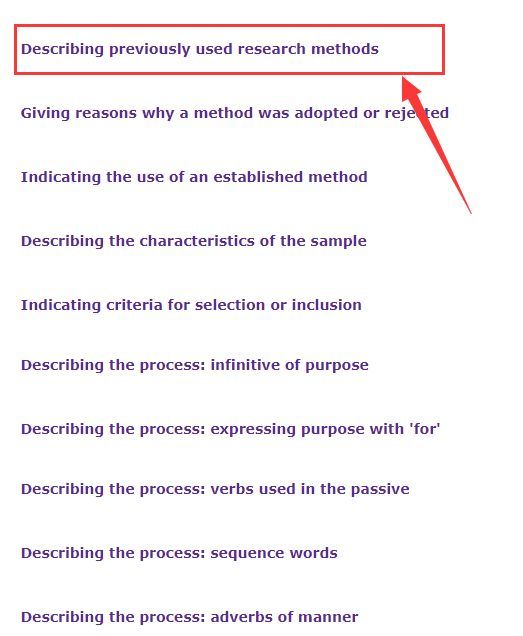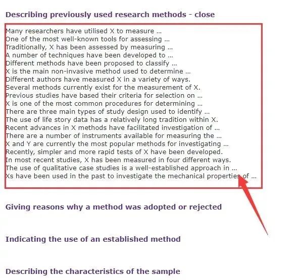 点击第一个选项“Describing previously used research methods ”,就会出现下面图中的万能句式模板,这对于缺乏写作经验和英语不在行的学者来说,可谓是神奇的宝典。