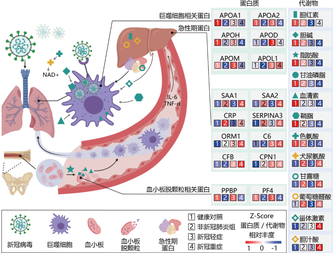 与对照(健康)组、普通流感组和轻症组相比,新冠肺炎重症患者的样本中出现了93种特有的蛋白表达和204个特征性改变的代谢分子。其中50种蛋白,与患者体内的巨噬细胞、补体系统、血小板脱颗粒有关。研究团队还发现,在新冠病毒感染的重症患者体内,有100多种氨基酸及100多种脂质均出现显著减少。这可能是病毒迅速扩增导致的消耗,为临床医生监控病情和制定调整治疗方案提供了一定的参考。