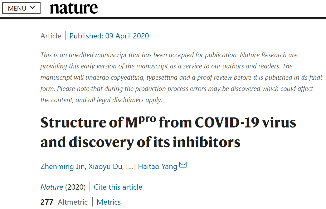 1. Zhenming Jin., et al ., Lambourne, L. et al. Structure of Mpro from COVID-19 virus and discovery of its inhibitors. Nature. 2020.