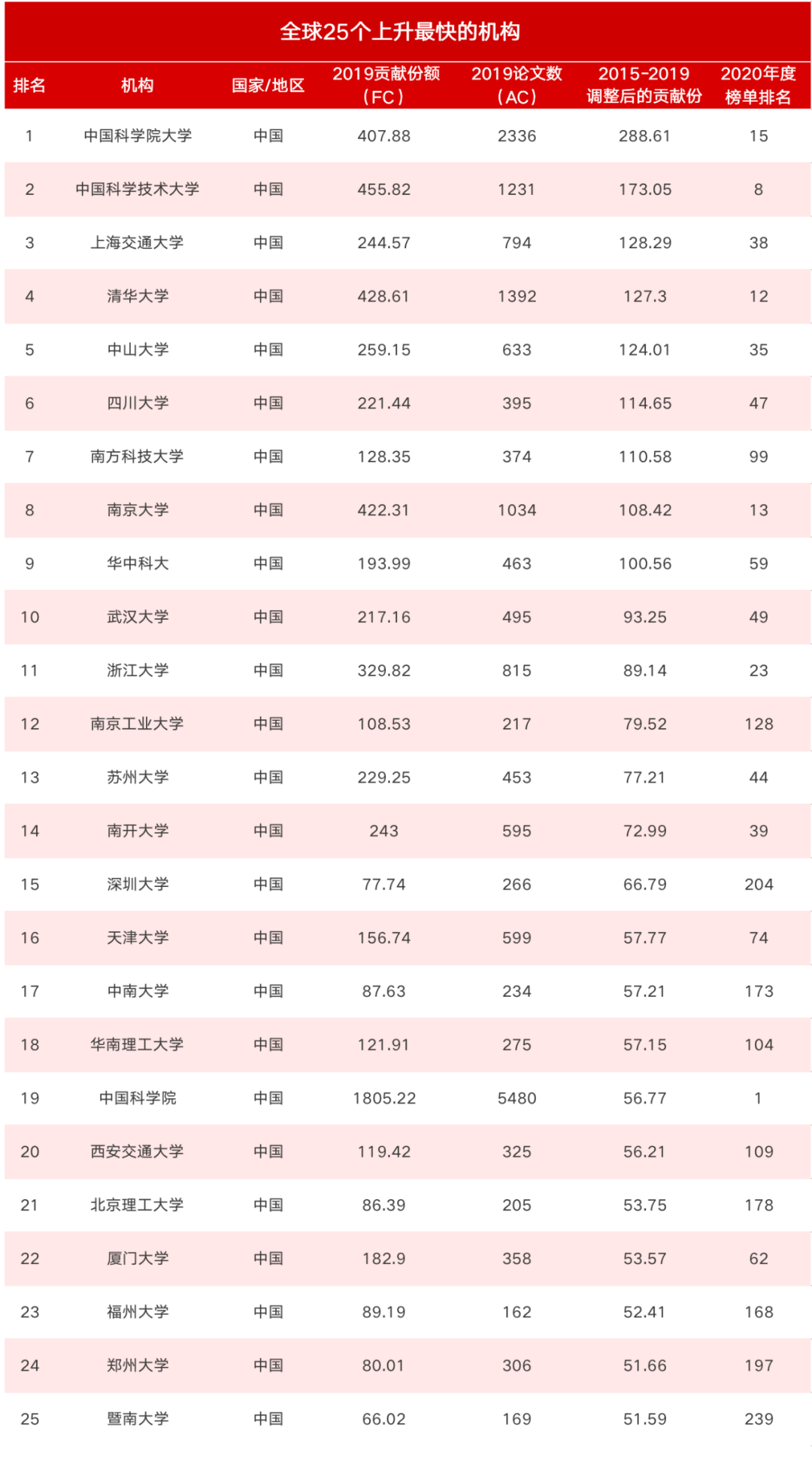 根据2015至2019年调整后的贡献份额的变化情况,升幅最快的前十家机构上升之星是中国科学院大学、中国科学技术大学、上海交通大学、清华大学、中山大学、四川大学、南方科技大学、南京大学、华中科技大学和武汉大学。