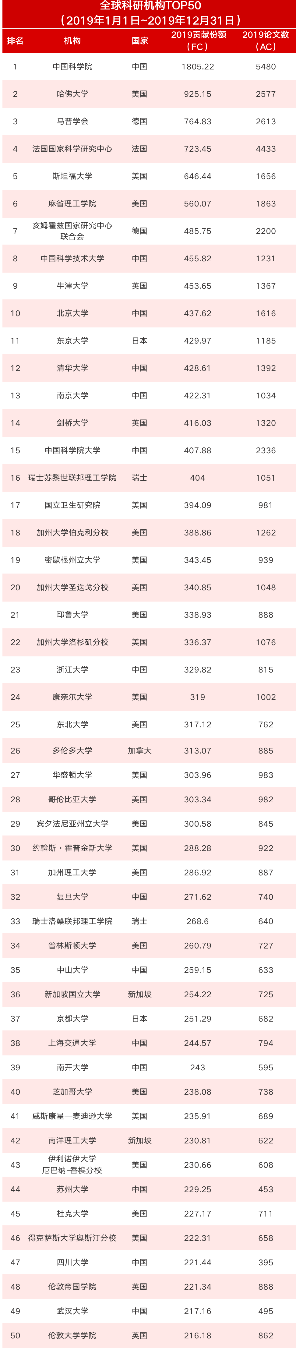 2019年贡献份额居前十的机构包括:中国科学院、哈佛大学、德国马普学会、法国国家科研中心、美国斯坦福大学、美国麻省理工学院、德国亥姆霍兹国家研究中心联合会、中国科学技术大学、英国牛津大学和北京大学。