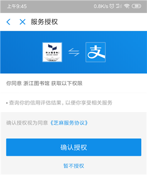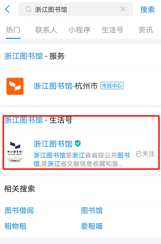 1、打开手机“支付宝”,搜索“浙江图书馆”,点击关注并允许其获取使用地理位置。