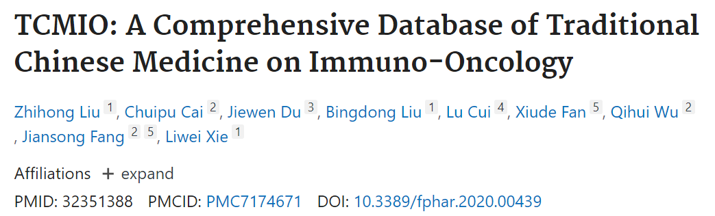 [2] Zhihong Liu, et al., TCMIO: A Comprehensive Database of Traditional Chinese Medicine on Immuno-Oncology. Frontiers in Pharmacology. 2020.