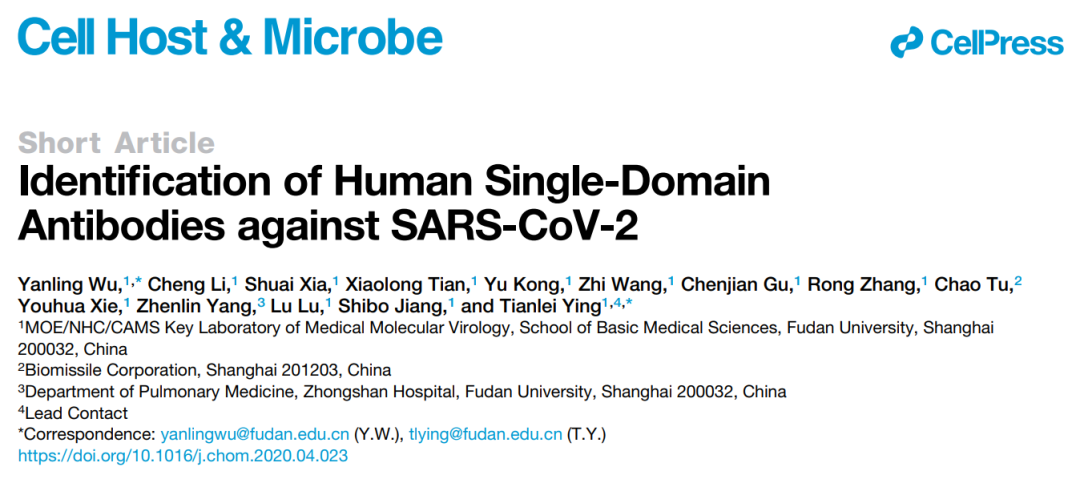 [1] Yanling Wu, et al., Identification of Human Single-Domain Antibodies against SARS-CoV-2. Cell Host & Microbe. 2020.