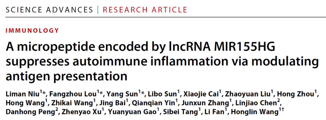 [3] Liman Niu, et al., A Micropeptide Encoded by LncRNA MIR155HG Suppresses Autoimmune Inflammation via Modulating Antigen Presentation. Science Advances. 2020.