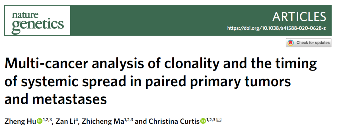 [4] Zheng Hu, et al., Multi-cancer analysis of clonality and the timing of systemic spread in paired primary tumors and metastases. Nature Genetics. 2020.