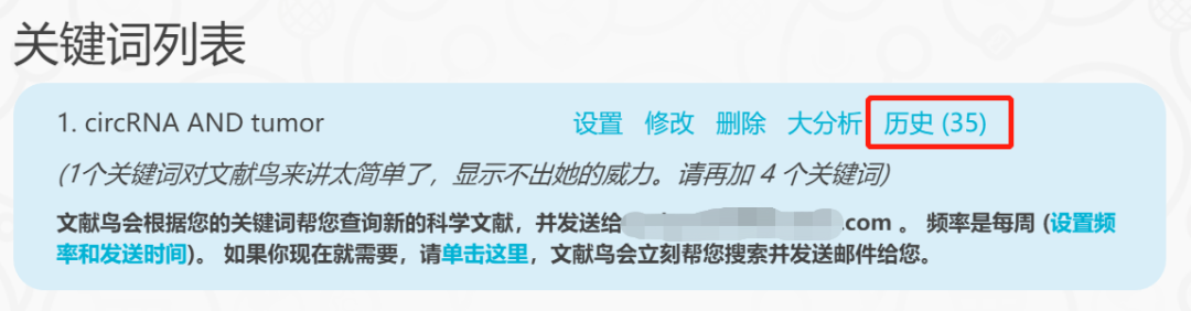 登录文献鸟,点击某个关键词右边的“历史”,显示近30天内推送的文献列表。