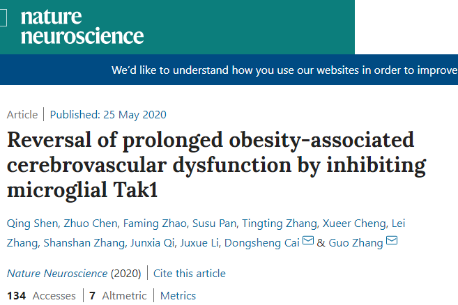 [1] Qing Shen, et al., Reversal of prolonged obesity-associated cerebrovascular dysfunction by inhibiting microglial Tak1. Nature Neuroscience. 2020.