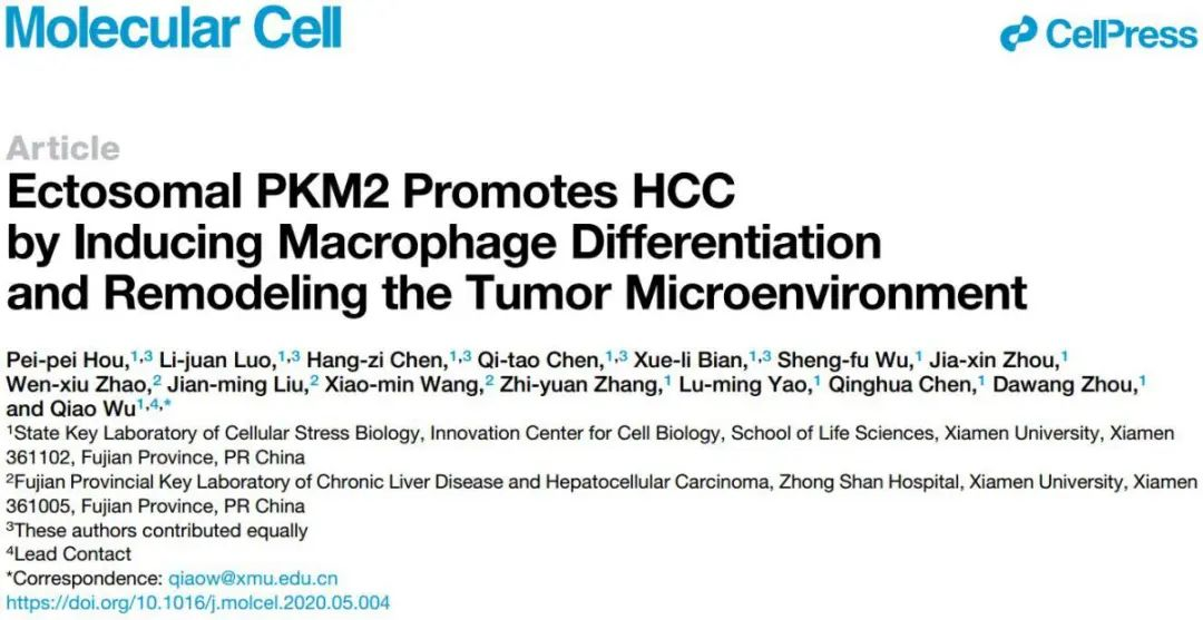 近日,厦门大学生命科学学院吴乔教授团队在《Molecular Cell》在线发表了题为:Ectosomal PKM2 Promotes HCC by Inducing Macrophage Differentiation and Remodeling the Tumor Microenvironment 的研究论文。