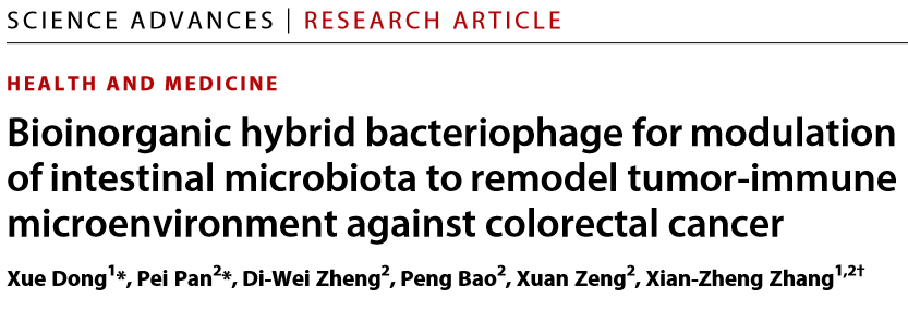 [3] Xue Dong, et al., Bioinorganic hybrid bacteriophage for modulation of intestinal microbiota to remodel tumor-immune microenvironment against colorectal cancer. Science Advances. 2020.