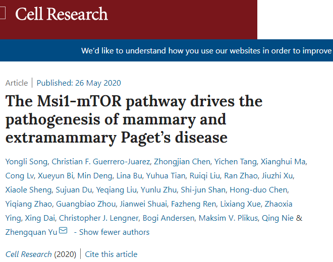 [2] Yongli Song, et al., The Msi1-mTOR pathway drives the pathogenesis of mammary and extramammary Paget’s disease. Cell Research. 2020.