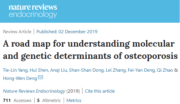 近日,杜兰大学/中南大学Deng Hong-Wen作为通讯,西安交通大学为第一通讯单位,杨铁林为第一作者在《Nature Reviews Endocrinology》在线发表题为:A road map for understanding molecular and genetic determinants of osteoporosis 的综述文章。