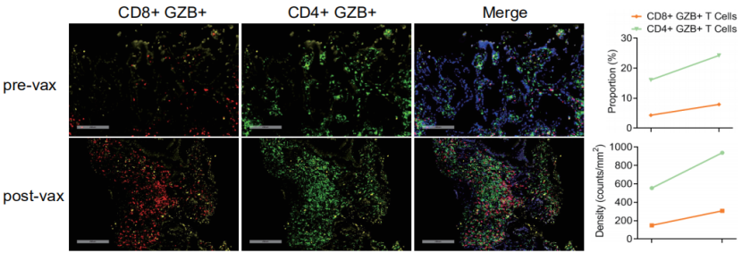 此外,通过患者治疗前后的全景免疫组化显示,肿瘤浸润淋巴细胞数量及比例,特别是激活的CD8+T细胞和CD4+T细胞均有大幅提高,证明了iNeo-Vac-P01多肽疫苗明显改善了肿瘤免疫微环境,让冷肿瘤变成热肿瘤。
