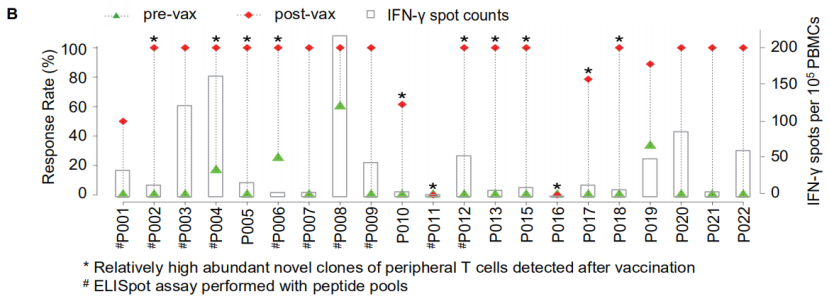 患者治疗后外周血免疫细胞的ELISpot实验证明,80%的iNeo-Vac-P01多肽疫苗激发了抗原特异性的免疫响应,证明了iNeo人工智能平台对新生抗原筛选的准确性及疫苗设计的有效性。