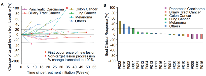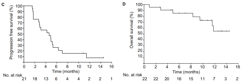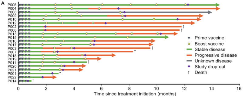 临床研究结果显示,经iNeo-Vac-P01单药治疗,患者疾病控制率(DCR)为71.4% (15/21),中位无进展生存期(PFS)为4.6个月(95% CI, 2.5-5.2),目前尚未达到中位总生存期(OS),12个月的总生存比例为55.1%((95% CI, 25.9% -76.9%)。通过TCR测序、T细胞亚群以及细胞因子检测,还发现了可以预测疗效的潜在生物标志物。