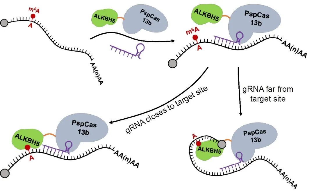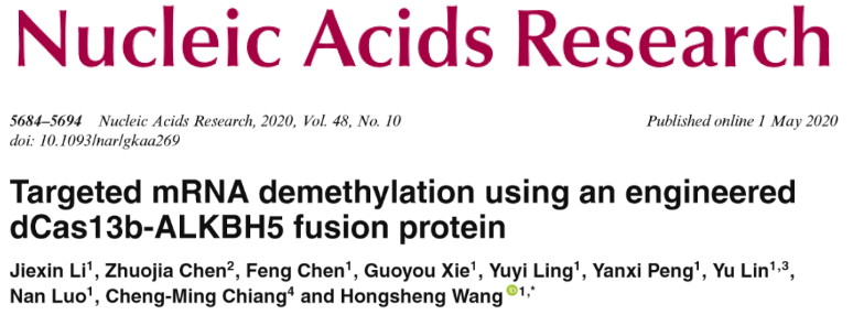 [2] Jiexin Li, et al., Targeted mRNA demethylation using an engineered dCas13b-ALKBH5 fusion protein. Nucleic Acids Research. 2020.