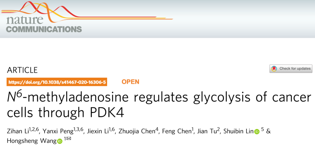 [1] Zihan Li, et al., N6-methyladenosine regulates glycolysis of cancer cells through PDK4. Nature Communications. 2020.