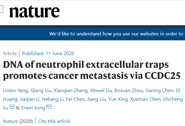 [1] Linbin Yang, et al., DNA of neutrophil extracellular traps promotes cancer metastasis via CCDC25. Nature. 2020.