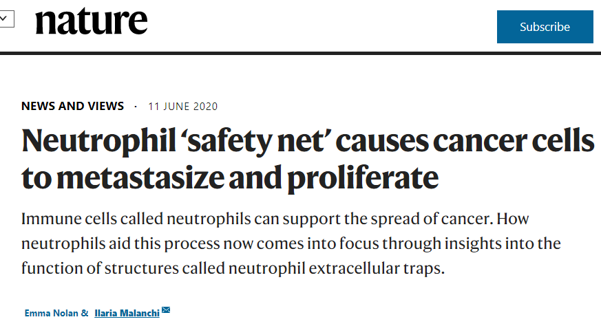 [1] Emma Nolan, et al., Neutrophil ‘safety net’ causes cancer cells to metastasize and proliferate. Nature. 2020.