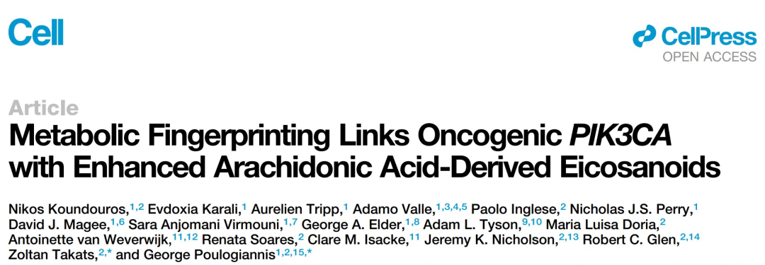 [1] Nikos Koundouros, et al. Metabolic Fingerprinting Links Oncogenic PIK3CA with Enhanced Arachidonic Acid-Derived Eicosanoids. Cell. 2020.