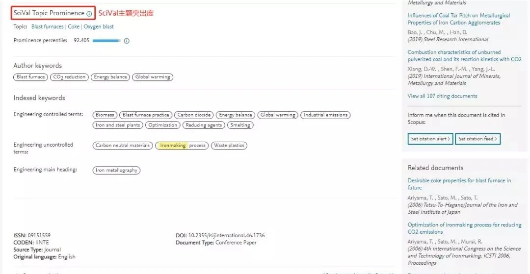 其次,Scopus还给出了SciVal主题突出度(也叫SciVal热门主题)评估,指出该文献研究内容所属的主题(topic)并进行度量(数值越大,代表突出度越高,全球关注度越高)。