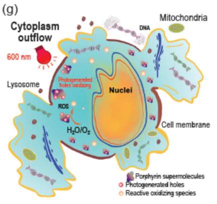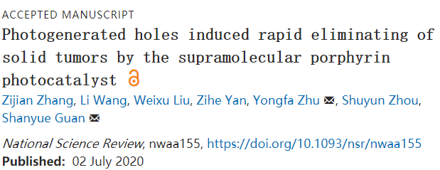 2020年7月2日,清华大学朱永法及中国科学院理化技术研究所Shanyue Guan共同通讯在《National Science Review》在线发表题为:Photogenerated holes induced rapid eliminating of solid tumors by the supramolecular porphyrin photocatalyst 的研究论文,该研究建立了一种超分子光催化剂Nano-SA-TCPP,可在600-700 nm波长下进行照射,治疗实体瘤,实体瘤(100 mm3)可以在10分钟内消除。