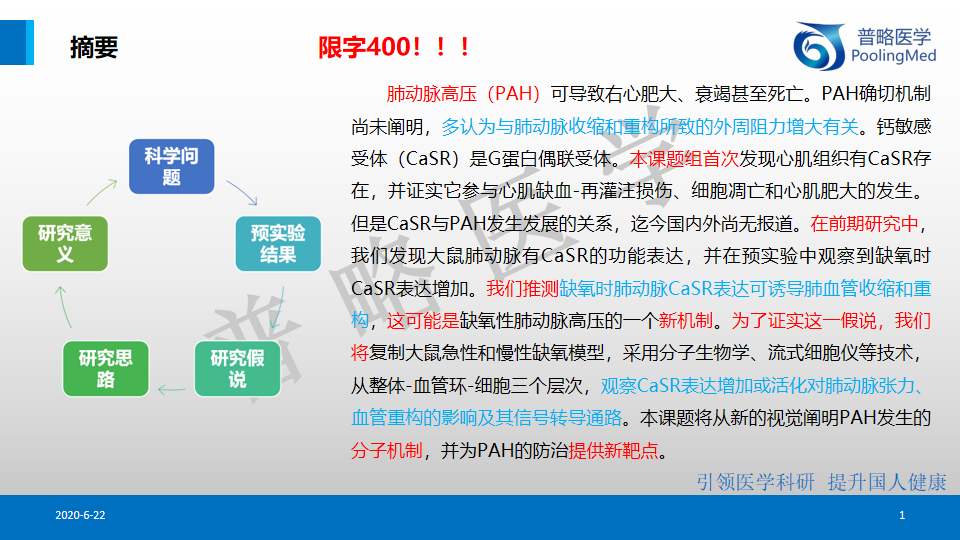 摘要一般包括科研问题、预实验结果、研究假说、研究思路和研究意义5大内容,因此可以参考固定的表达方式。科研问题可以表达为“XX疾病研究尚存在XX问题”;预实验结果和研究假说可表达为“本课题组发现XXX,由此推测XXX”;研究思路可表达为“为验证这一假说,我们将XXX”;研究意义可表达为“本研究将XXX,发现XXX,提供XXX”。需注意的是,线上申报填写摘要有400字的字数限制(含标点符号),因此需要用简短的话语表述清楚摘要所需包含的内容。