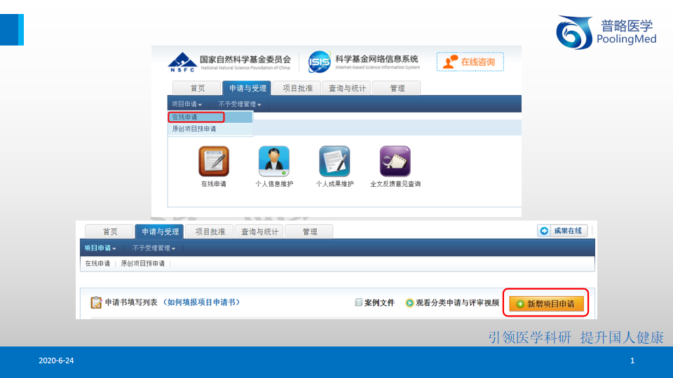 1、登录网上填报系统,在“申请与受理”处选择“项目申请”下的“在线申请”,然后点击“新增项目申请”。