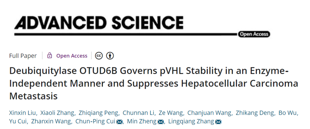 近日,一项发表在《Advanced Science》(IF=15.804)的来自军事医学研究院张令强研究员、崔春萍研究员和浙江大学医学院第一附属医院的郑敏教授合作研究发现去泛素化酶OTUD6B能够抑制pVHL的泛素化降解,负调控HIF信号,进而抑制肝细胞癌的转移。