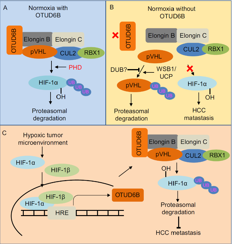 OTUD6B是迄今为止报道的第一个能够抑制pVHL泛素化的去泛素化酶。更有意思的是,他们发现OTUD6B对pVHL的去泛素化调控不依赖于其酶活性,而是通过与pVHL相互作用,增强CBCVHL泛素连接酶复合体的稳定性,减少WSB1和UCP对pVHL的泛素化降解实现的。这为理解OTU亚家族去泛素化酶和Cullin-RING型泛素连接酶的作用机制提供了新的认识。此外,他们还发现,OTUD6B作为HIF的靶基因,能够感应细胞内氧的变化,在缺氧条件下被快速诱导上调,并发挥其生理功能。