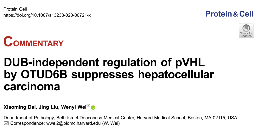 值得一提的是,哈佛大学魏文毅教授等在《Protein Cell》杂志发表评述文章,指出该研究揭示了抑癌蛋白pVHL稳定性调控的新机制,为肝细胞癌的临床治疗提供了新的策略。同时,他们也认为该研究揭开了人们对OTU家族去泛素化酶作用机制的新的认识,对OTUD6B N端结构的解析及OTUD6B基因敲除小鼠表型的研究,将有助于进一步认识OTU家族去泛素化酶的特性。